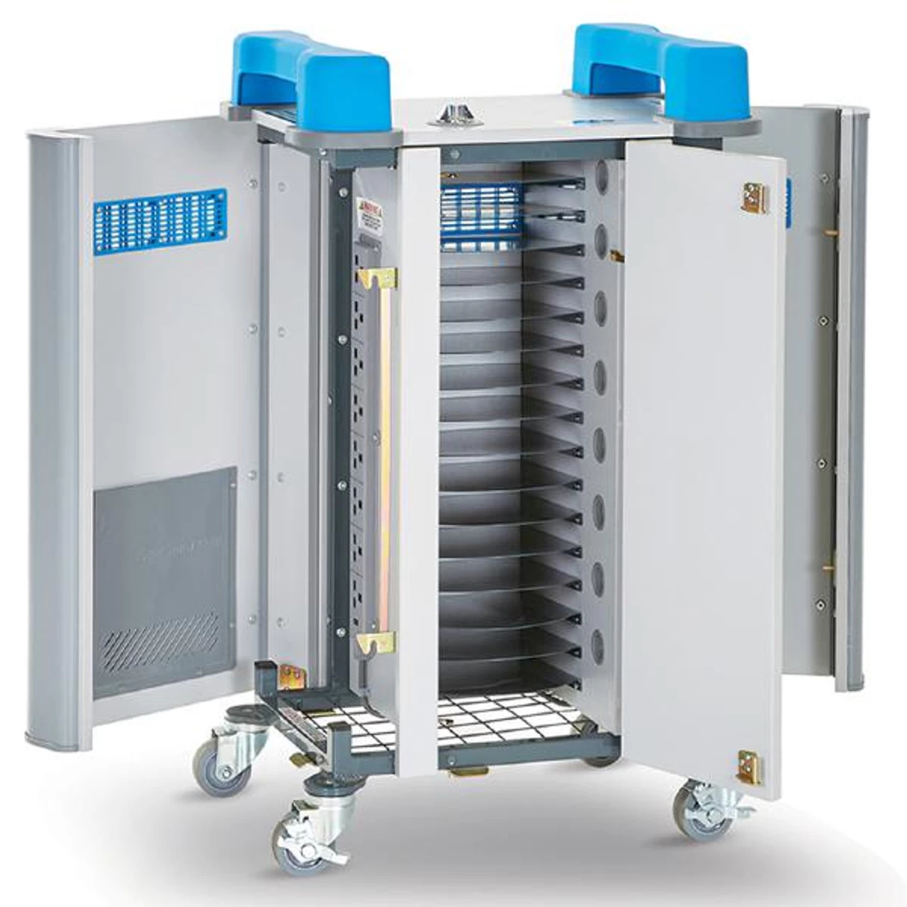 The ‘TabCabby 16 Horizontal Compact’ charges 16 Tablets up to 12″; screen size including their protective cases. The horizontal storage shelves store two devices side by side within a compact footprint. The TabCabby offers fast, flexible and simultaneous charging with a programmable timer. Maximum security safety is guarenteed with dual point locking system and separate lockable power compartment. It’s easy to move with ergonomic top handles, rounded corner bumpers and multi-directional non-marking wheels. The TabCabby offers silent charging with unique ventilation system and a built-in heat sensor shuts off power automatically if over-heating occurs.