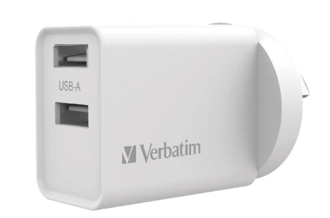 Verbatim USB Charger Dual Port 2.4A – White Twin Port Wall Charger Specification ¢ Input: 100Vac – 240Vac, 50/60Hz, 0.35A. ¢ Output: 5Vdc/2.4A. ¢ Smart IC. ¢ Over current protection. ¢ Over voltage protection. ¢ Short circuit protection. ¢ Over temperature protection. ¢ Material: PC Fire resistant material. ¢ Colour White Features & Benefits ¢ Quality  Compliant with Australia/New Zealand Electrical Safet Standards giving peace of mind that it will work as expected and not damage your devices. ¢ Convenient  Charge your devices faster with up to 2.4A of current. The white design allows this charger to blend in with your existing cables. 66593 enables you to charge two devices at once.